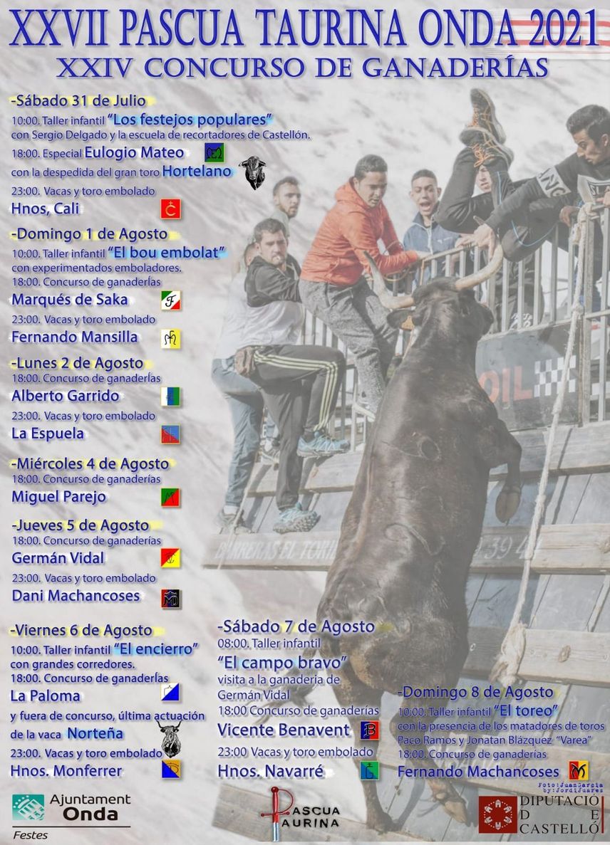 Esta edición será del 31 de julio al 8 de agosto, ocho días seguidos de astados. El programa incluye 14 hierros. El cartel de la pascua taurina de onda 2021 es precioso: