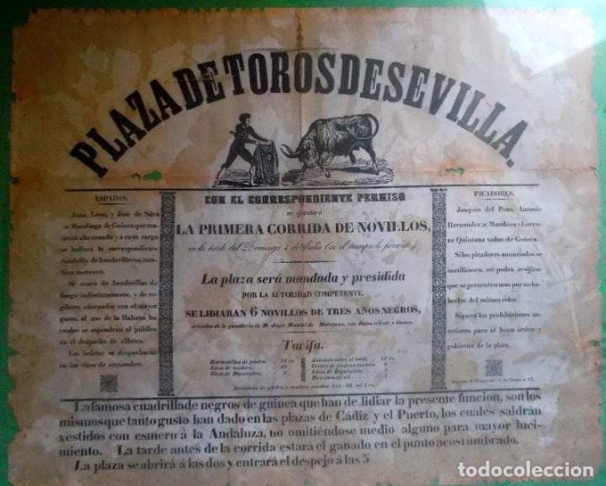 En la plaza de toros de Sevilla con este cartel de Antonio Pineda Valde @AntonioPinedaVa vemos que Guinea debió tener una buena afición, lo suficiente como para organizar una cuadrilla de negros toreros incluyendo a los picadores.