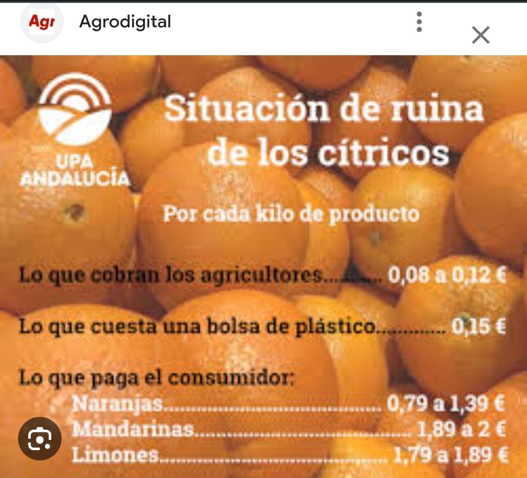 Tiene que quedar aquí para que todos veamos a dónde nos han llevado con sus teorías: un kilo de naranjas, 0.12 céntimos; una bolsa de plástico, 0.15 céntimos. ¿Qué agricultura sobrevive así?