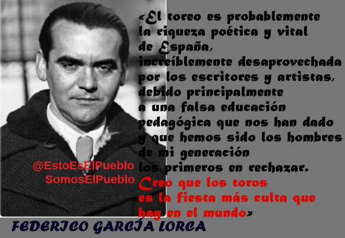 El poeta Miguel Hernández era un gran aficionado a los toros. Federico García Lorca también era un aficionado sublime al arte de Cúchares. O José Bergamín, por nombrar solo a tres. Y si a ustedes no les importa, señores antitaurinos por causa del sufrimiento animal, prefiero deleitarme con estos escritores de talla mundial cuyas obras alcanzan un lirismo y una indagación y expresión de sentimientos muy superiores a los ejemplos que encontramos en los "antitaurinos sentimentales".