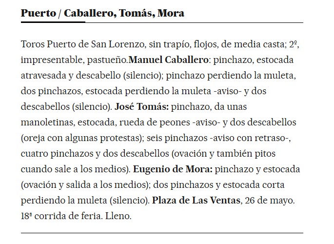 Toros Puerto de San Lorenzo, sin trapío, flojos, de media casta; 2º, impresentable, pastueño.Manuel Caballero: pinchazo, estocada atravesada y descabello (silencio); pinchazo perdiendo la muleta, dos pinchazos, estocada perdiendo la muleta -aviso- y dos descabellos (silencio). José Tomás: pinchazo, da unas manoletinas, estocada, rueda de peones -aviso- y dos descabellos (oreja con algunas protestas); seis pinchazos -aviso con retraso-, cuatro pinchazos y dos descabellos (ovación y también pitos cuando sale a los medios). Eugenio de Mora: pinchazo y estocada (ovación y salida a los medios); dos pinchazos y estocada corta perdiendo la muleta (silencio). Plaza de Las Ventas, 26 de mayo. 18ª corrida de feria. Lleno.