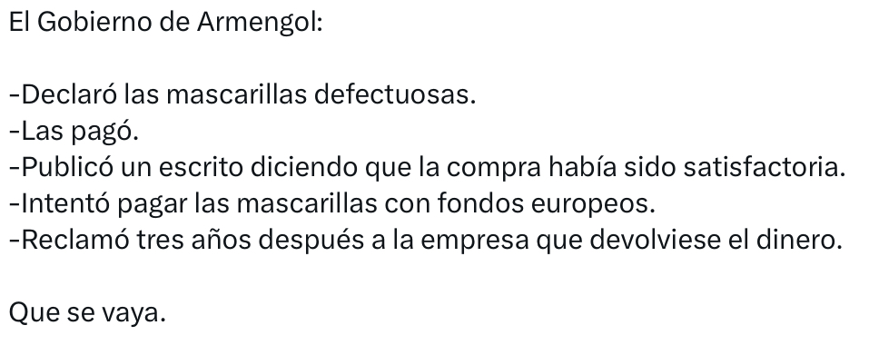 Esto es lo de Armengol, lo suficiente para dimitir media docena de veces, pero no dimite: Compró mascarillas defectuosas y pagó; quiso dejar por escrito que las mascarillas eran adecuadas; quiso pagar tiempo después con fondos europeos; tres años después, tres, reclamó la devolución del dinero.