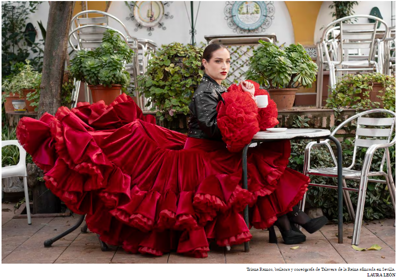 El movimiento de sus manos corta el aire. El silencio, casi sepulcral, se interrumpe con el constante flash de la cámara. Triana Ramos (Talavera de la Reina, Toledo, 1997) interpreta una coreografía improvisada en un tablao en el barrio de La Macarena, en Sevilla, para las fotografías que acompañan a este reportaje. Ha llegado tarde a la cita, pero tiene excusa. Ha pasado la mañana recorriendo la ciudad en busca de unos trajes de flamenca y de unos mantos de novia. “Quería algo que no fuese muy clásico, que me representase mejor”, comenta. Son las doce de la mañana y lleva despierta desde las 5.30. Para prepararlo todo, dice. En los últimos años ha sido la coreógrafa del videoclip Amor amé de David Bisbal, del Motomami World Tour de Rosalía, de la última campaña de Cruzcampo y ha bailado en la final de la UEFA Europa League de 2022, además de haberse subido a los tablaos más reputados de España.