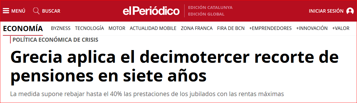 Llega la crisis de las pensiones, la misma que están padeciendo en Grecia, en silencio, desde hace unos años, y que se resume en este recorte del prensa tomado de El Periódico de Cataluña. Y así como la crisis de la construcción y de las hipotecas tuvo consecuencias gravísimas: paro, deuda, desahucios, etc., la que se avecina con las pensiones será otro tanto. Porque no hay dinero para tanta pensión; y ningún banco prestará dinero a España para el pago de pensiones sin garantía de devolución. Y en este drama ¿qué partido puede recortar las pensiones? Empezamos a hablar de elecciones.