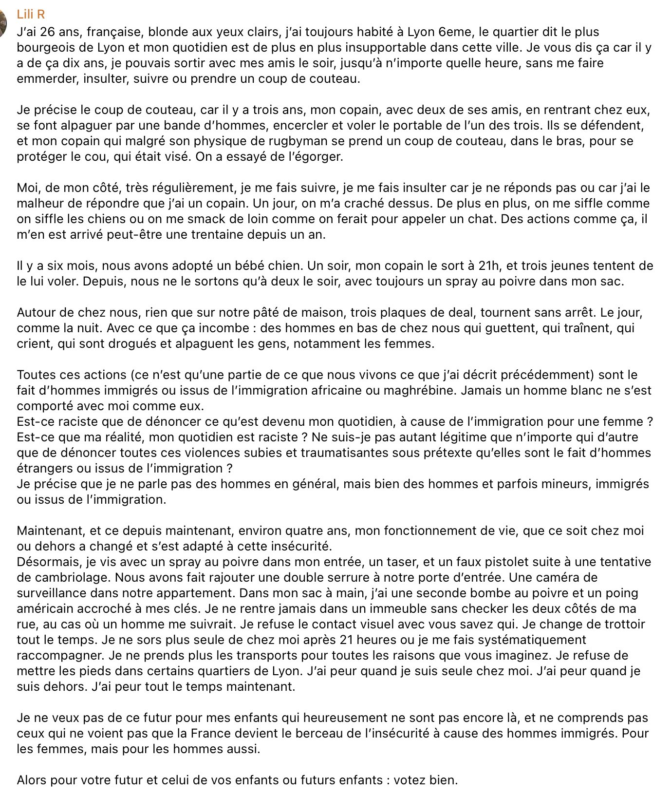 Tengo 26 años, soy francesa, rubia de ojos claros, siempre he vivido en el 6º distrito de Lyon, el barrio más burgués de Lyon y mi día a día es cada vez más insoportable en esta ciudad. Les digo esto porque hace diez años, podía salir con mis amigos por la noche, hasta cualquier hora, sin que me molestaran, insultaran, siguieran o apuñalaran.