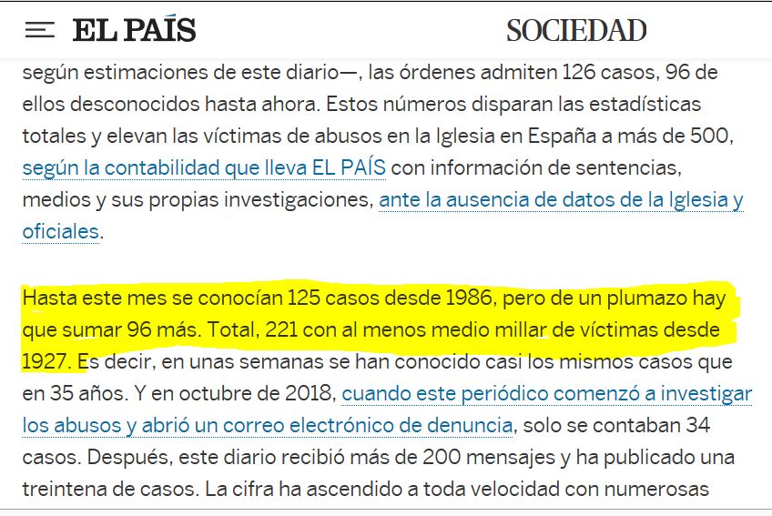 El diario El País puso a disposición de los lectores en octubre de 2018 un correo electrónico para denunciar abusos de menores solo en la iglesia católica en España. Lo curioso es que en el reportaje no mencionan el caso de Montserrat y sí los de otras órdenes religiosas. Medio millar de víctimas desde 1927.