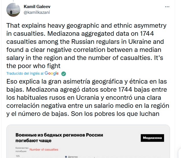 Traducido por google, las regiones pobres de Rusia son las que más soldados envían al ejército, un hilo de tuits en inglés del que me llega uno traducido: https://twitter.com/kamilkazani/status/ ... 9647758339