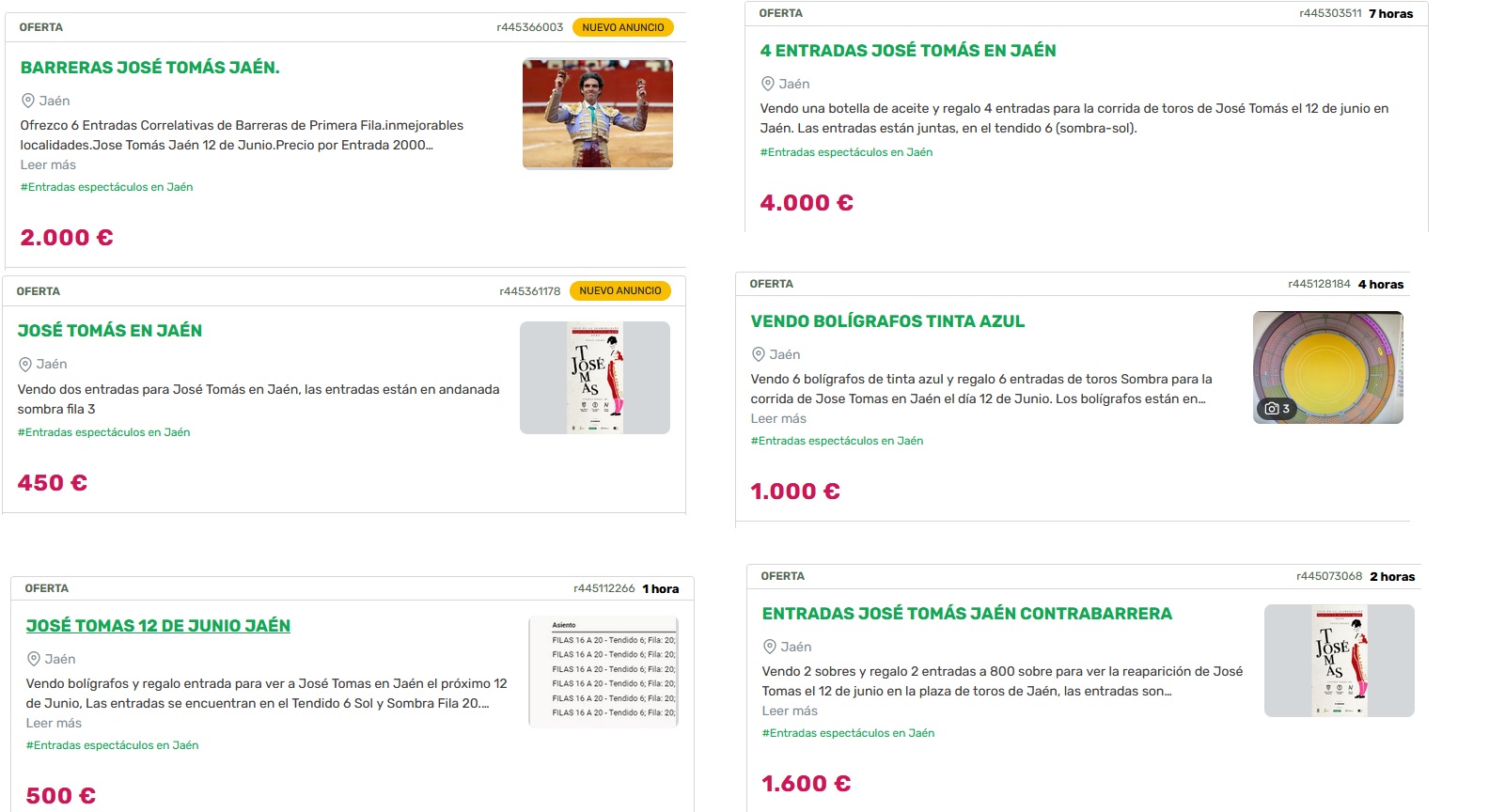 La corrida de toros de José Tomás el próximo mes de junio en Jaén tiene todo el papel vendido, pero ha salido a la reventa y aquí unos cuantos anuncios para que veáis la capacidad de vender entrada de JT