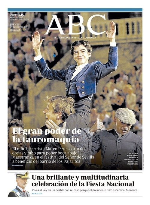 Primera plana de abc de Sevilla íntegra para un "niño torero", Marco Pérez; abajo, un pequeño espacio para las celebraciones de la Fiesta Nacional con retrato del Rey de España, también a tamaño reducido.
