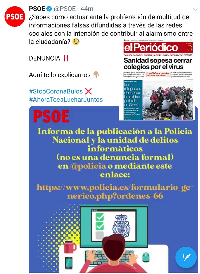 Sirva esta historia para centrar el poster "sovietizante" con el que los camaradas socialistas del PSOE solicitan a su militancia denuncias contra aquellos que difundan bulos que puedan dañar la política del líder "Yo persona", es decir, Pedro Sánchez, conocido en las calles madrileñas como Pedro Primero el Sepulturero.