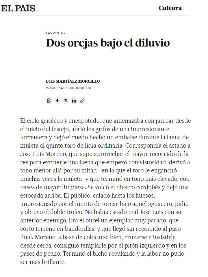 Así escribieron en El País sobre aquella faena de José Luis Moreno bajo el diluvio: