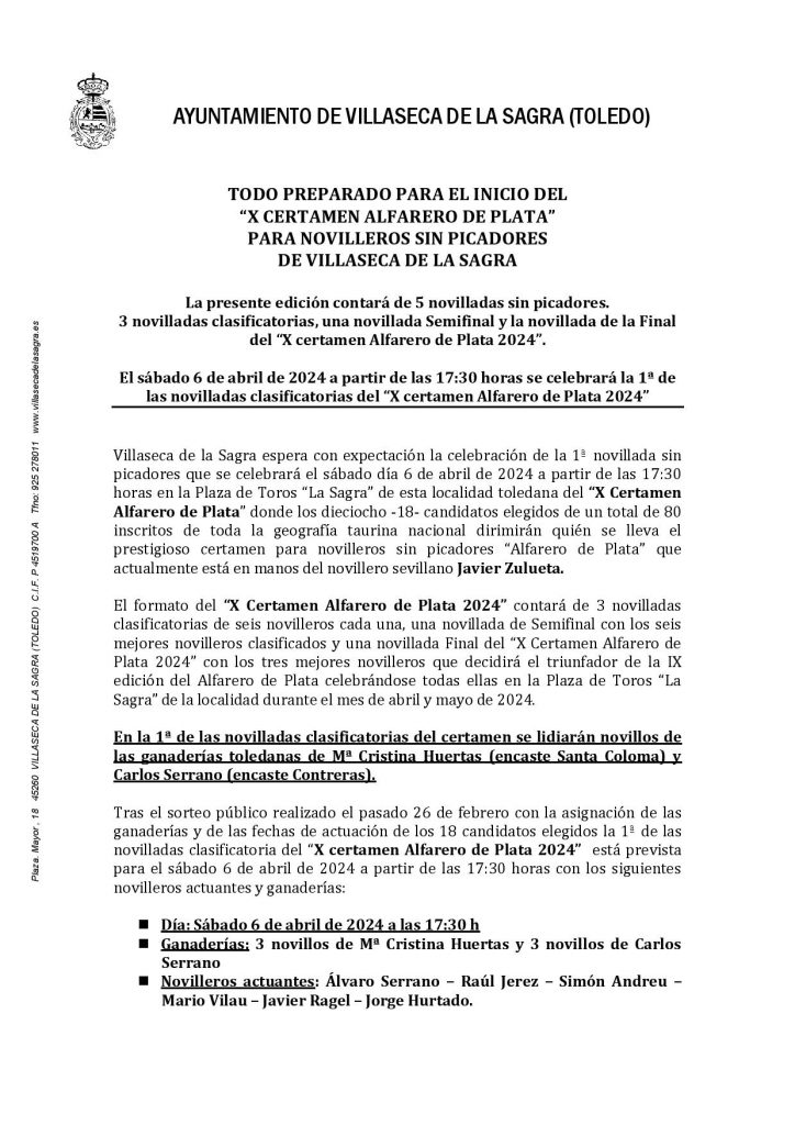 El X Certamen Alfarero de Plata, organizado por el Ayuntamiento de Villaseca de la Sagra, es un evento destacado en el mundo de la tauromaquia, especialmente dirigido a novilleros sin picadores. Este certamen no solo busca difundir y fomentar la fiesta de los toros, sino también promover nuevos valores en el ámbito taurino, complementando así el ya consolidado Certamen Alfarero de Oro, que se celebra con novilleros con caballos en septiembre.