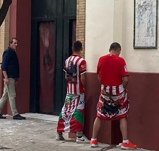 Acaba de marcar el Mallorca. Y vamos a dar una alegría a la afición. Los culpables son estos perros que mean sin que sus amos sean capaces de educar en los mínimos valores. Aficionados del @AthleticClub orinando en la fachada de la Basílica de la Hermandad del Cachorro @HdadCachorro