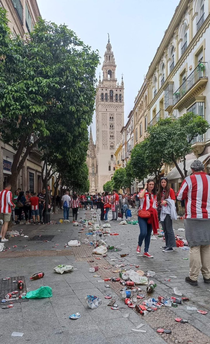 Aficionados del Athletic con sus éxtasis etílico pasean por un puente de Sevilla:
