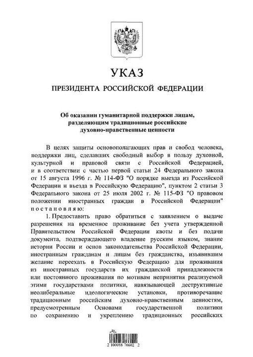 Con el fin de proteger los derechos y libertades fundamentales de las personas y apoyar a aquellos que han elegido libremente una conexión espiritual, cultural y legal con la Federación Rusa, y de conformidad con la parte primera del artículo 24 de la Ley Federal del 15 de agosto de 1996 N.º 114-FZ "Sobre el procedimiento de salida de la Federación Rusa y entrada a la Federación Rusa", y con el punto 2 del artículo 3 de la Ley Federal del 25 de julio de 2002 N.º 115-FZ "Sobre el estatus legal de los ciudadanos extranjeros en la Federación Rusa", decreto lo siguiente: