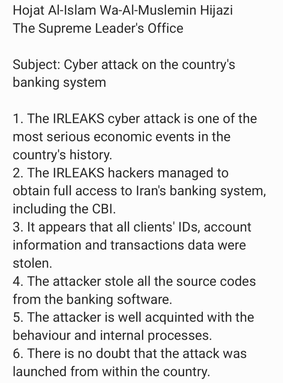 Anuncian el "hackeo total" de todo el sistema bancario de Irán, incluyendo el Banco Central del país. Se han apoderado de todas las cuentas con sus ID y últimos movimientos. Irán podría ver su economía gravemente afectada.