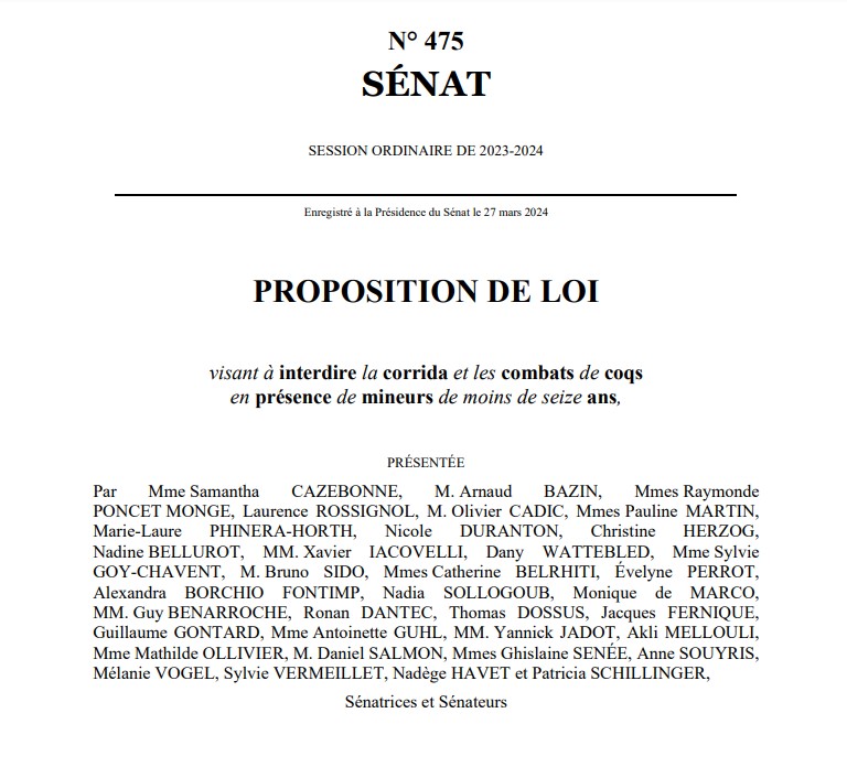 El proyecto de ley PPL n.º 475, presentado en el Senado francés por el grupo RDPI (Rassemblement des Démocrates, Progressistes et Indépendants) en marzo de 2024, busca prohibir la asistencia de menores de 16 años a corridas de toros y combates de gallos. Este texto, impulsado por la senadora Samantha Cazebonne y otros miembros de diferentes partidos, tiene como objetivo proteger a los menores de la exposición a la violencia hacia los animales, al considerar que estos espectáculos pueden tener un impacto negativo en su desarrollo emocional.