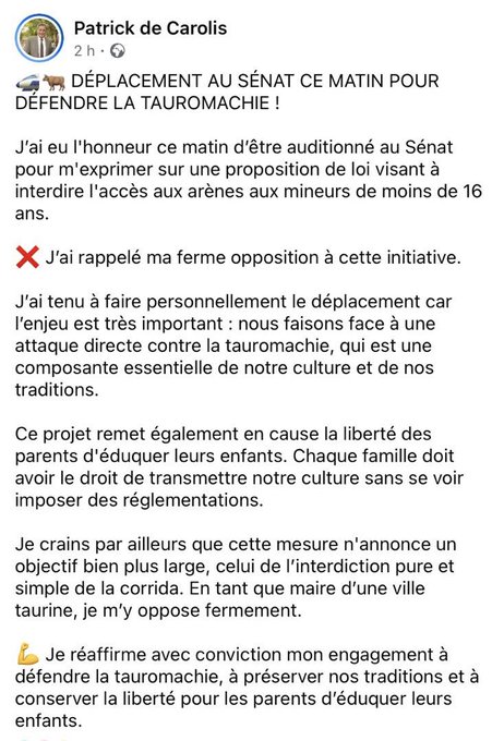 Patrick de Carolis @CarolisPatrick alcalde de Arles @VilleArles se ha desplazado hasta París para intervenir en el Senado en defensa de la tradición, de la cultura y de la libertad. Es un ataque directo contra la tauromaquia; debemos defender que corresponde a los padres educar a los hijos; lo que pretenden, finalmente, es prohibir los toros. Bravo por el alcalde.