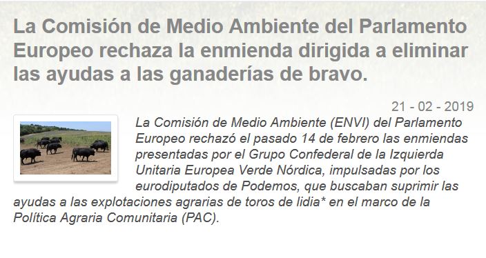 Re: El Parlamento Europeo vota retirar las ayudas agrícolas a producciones vinculadas con la tauromaquia