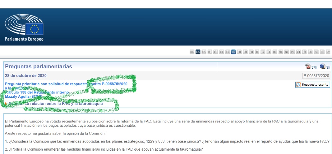 Desde el entorno de Mazaly Aguilar, diputada por VOX y vicepresidenta tercera de la comisión de Agricultura del Parlamento Europeo nos hacen llegar la respuesta a la pregunta de Mazaly Aguilar "“2. En el marco actual de la PAC no hay ayudas destinadas a apoyar la ganadería de reses bravas. Desde la reforma de 2003, los agricultores y ganaderos pueden recibir pagos directos con independencia de la producción o el destino del producto, ya que la gran mayoría de los pagos son pagos disociados. Aunque no se excluye que los Estados miembros puedan apoyar indirectamente a los ganaderos de reses bravas mediante la concesión de ayuda asociada voluntaria, el uso final de los animales subvencionados no se rige por las normas de la Unión."