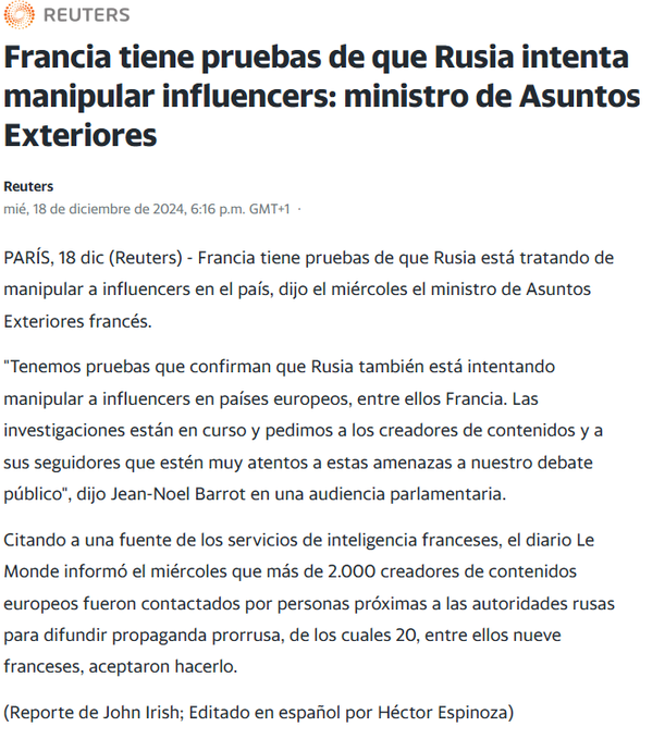 Francia ha señalado a Rusia por intentar manipular a influencers dentro de su territorio y en otros países europeos, según el ministro de Asuntos Exteriores, Jean-Noel Barrot. Durante una audiencia parlamentaria, Barrot instó a los creadores de contenido a permanecer alerta ante las amenazas a la integridad del debate público.