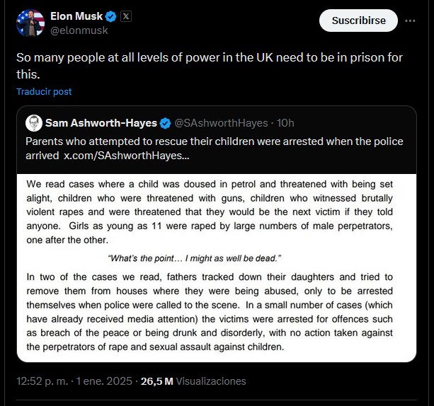 ¿Habéis oído hablar de Rotherham, en Gran Bretaña? Seguro que sí. Un caso de violaciones en manadas de hombres contra niñas de hasta once años. El caso fue "tapado" por los medios. Pero Elon Musk, precisamente en año nuevo, ha "repostedado" y de momento, lleva casi 30 millones de visualizaciones. Es muy probable que el fondo del asunto, el caso Rotherham, vuelva a los medios, con lo que el escándalo se multiplicará.