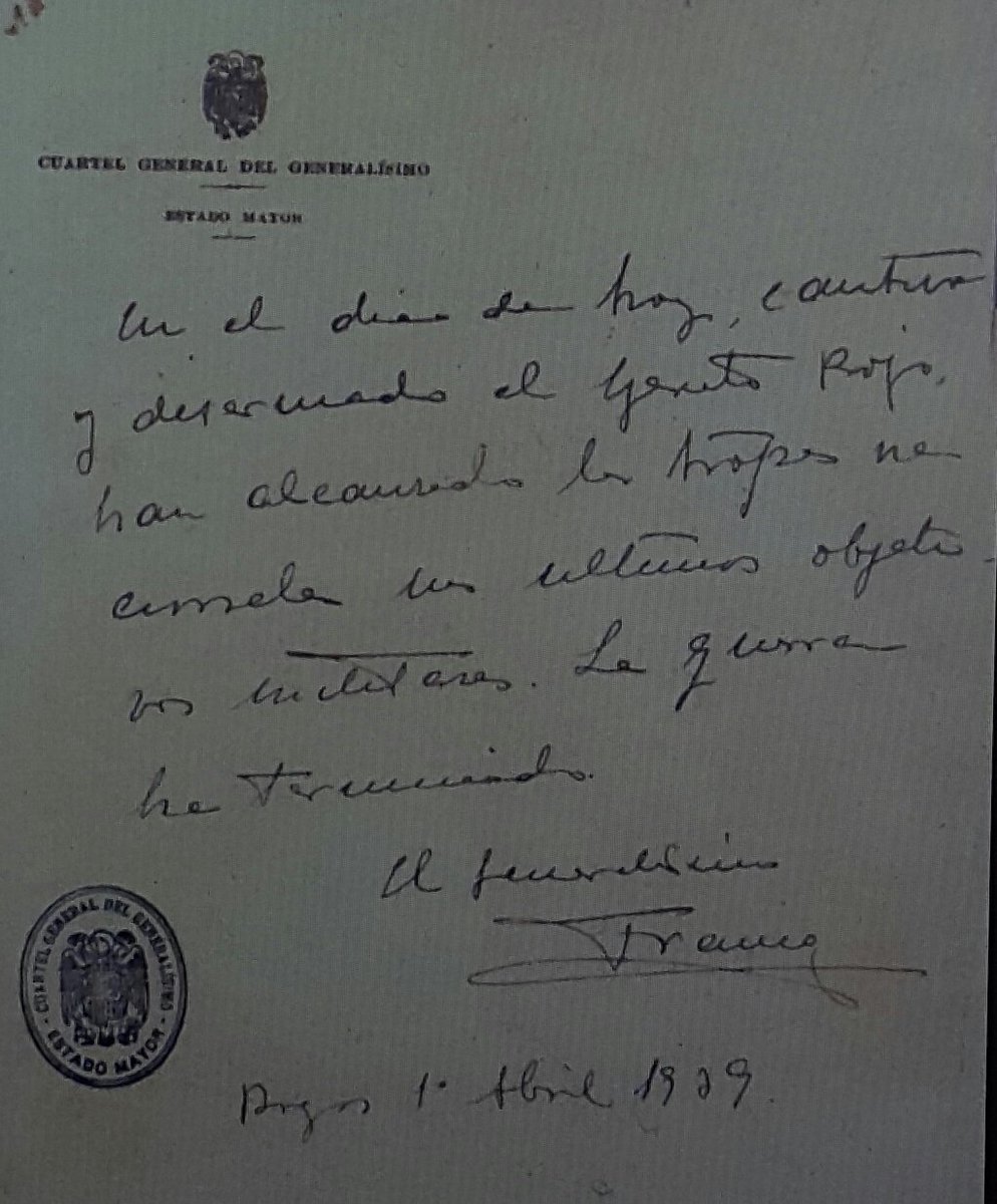 y desarmado el Ejército Rojo, han alcanzado las tropas nacionales sus últimos objetivos militares. La guerra ha terminado." Fdo.