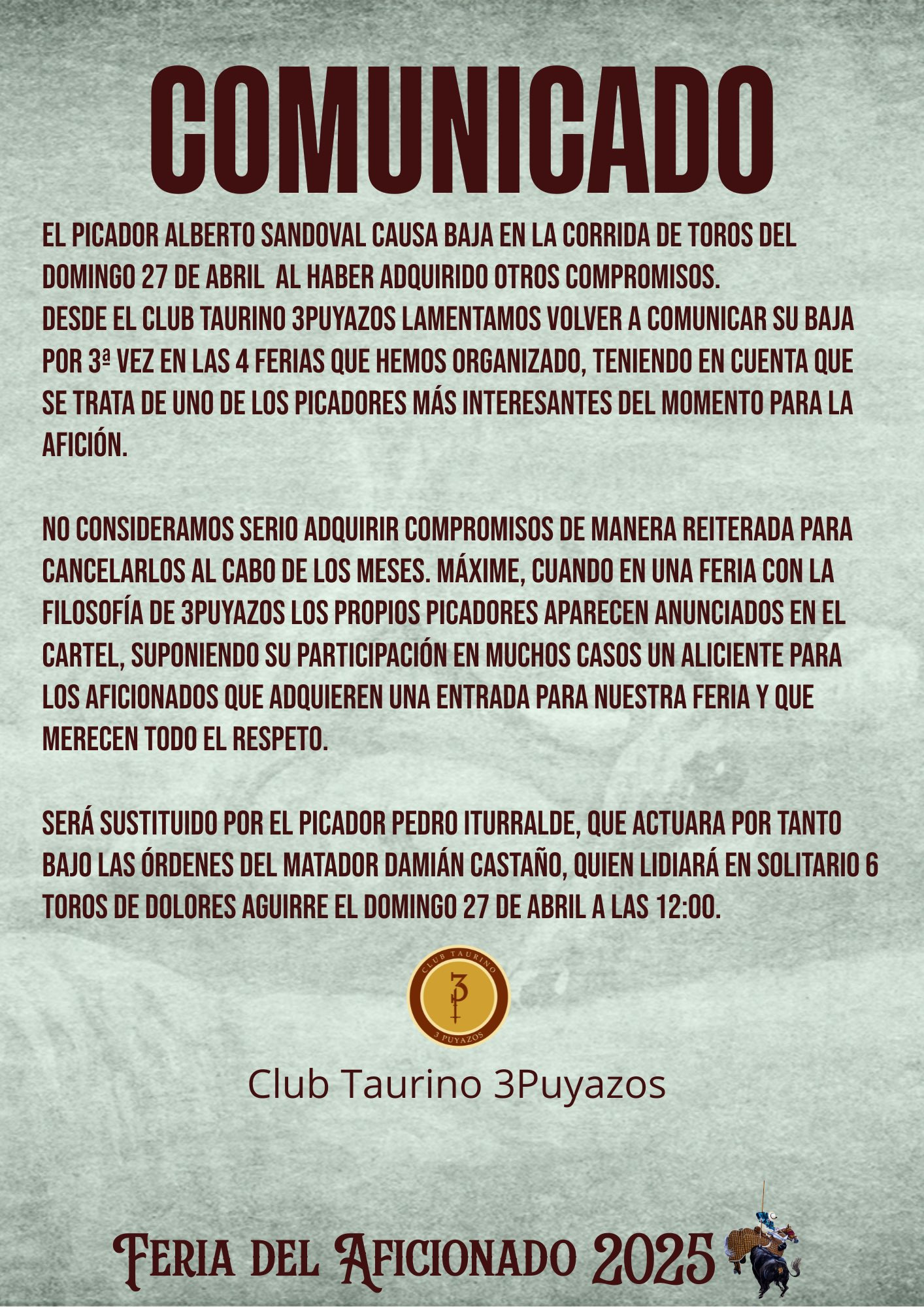 Dos picadores causan baja en el club tres puyazos, Juan Melgar, y Pedro Iturralde también. No se presentan al examen en San Agustín de Guadalix. Ocupan su plaza Héctor Vicente, y con los de Dolores Aguirre, Héctor Piña.