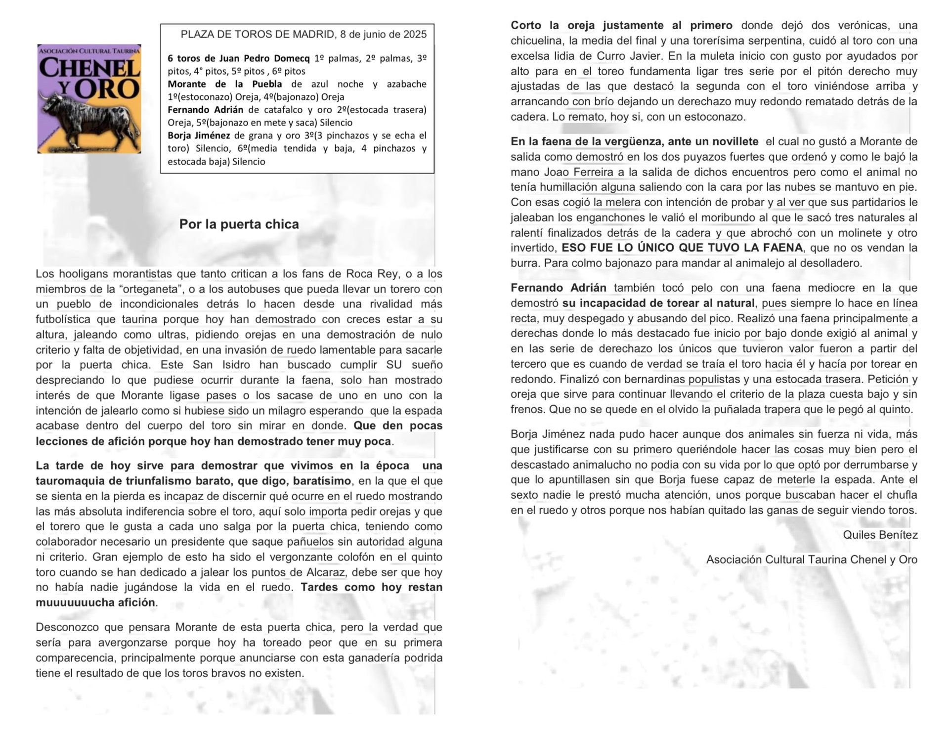 la Asociación Cultural Taurina Chenel y Oro ha recibido tal sartenazo por su escrito, que da vergüencita: Por Despaciosidad @despaciosidad