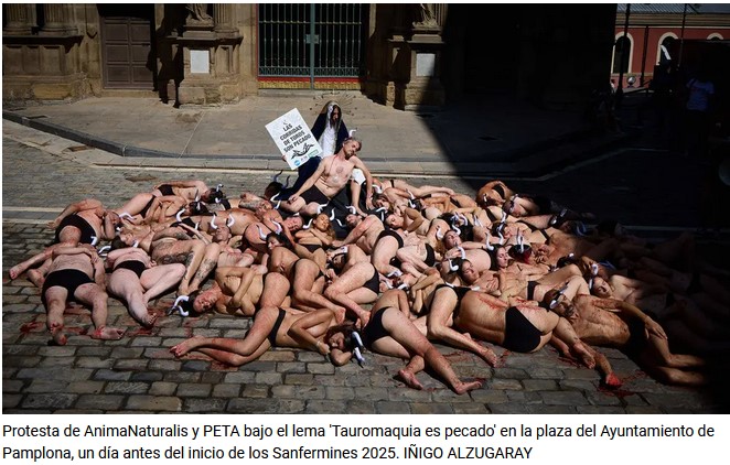 Que los antitaurinos son una minoría lo saben ellos mejor que nadie. Necesitan ruido. Necesitan insultar y ofender para llamar la atención. No tienen otros medios. Esta es la "gran manifestación" antitaurina en Pamplona: ni un centenar; como las que apoyan a Sánchez en Ferraz estos días.