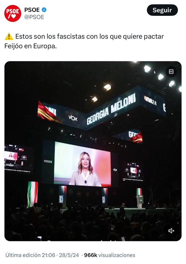 «Estos son los fascistas con los que quiere pactar Feijóo en Europa». Esta fue la frase que el PSOE utilizó para acompañar un vídeo en X en el que criticaba que el presidente del PP «blanquea» a la presidenta Italiana.