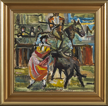 De ese impacto nacieron óleos, dibujos y gouaches que hoy se reconocen por su mezcla de síntesis y tensión: diagonales vivas, contrastes terrosos, irrupciones de rojo que cortan la composición como un latido. En su serie española —dispersa hoy en colecciones suecas y danesas— se percibe la misma convicción que expresaría años más tarde: “La tauromaquia es un orden antiguo; no describe, revela”. Los estudiosos consideran su producción taurina como una de las lecturas más personales de la fiesta realizadas por un pintor nórdico en el siglo XX.