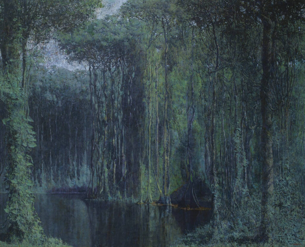 Esa etapa de madurez lo vuelve reconocible al primer golpe de vista: superficies trabajadas con paciencia, veladuras, raspados y una construcción de volumen que puede parecer gruesa, pero termina siendo lisa, controlada, casi de altorrelieve. En sus figuras humanas —especialmente los desnudos— hay una solemnidad sin estridencia: sensualidad, sí, pero también gravedad. Y en sus paisajes tropicales o lacustres —con el Lago Cocibolca y los recuerdos de Granada al fondo— se percibe una luz que no es postal, es tiempo: una luz que parece venir de la memoria.