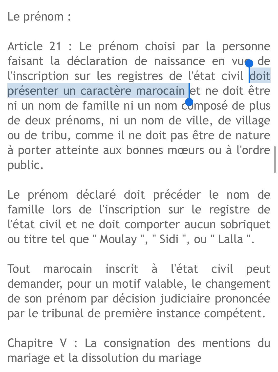 En Marruecos existe una lista oficial de nombres para niños nacidos en Marruecos o de nacionalidad marroquí. El nombre propio debe ser árabe y musulmán. Y el gobierno tiene una lista oficial de nombres válidos para niños y niñas.