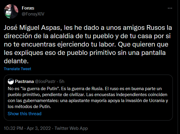 Aquí véis la prepotencia y la chulería de tuiter, censuran la cuenta de Will Smith por la bofetada; pero la de Putin, que ha provocado una guerra o la de Maduro, acusado de crímenes de lesa humanidad, activas.