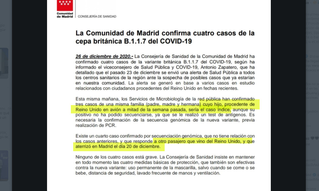 Ya está en Madrid la cepa inglesas del coronavirus con alto poder contagioso: llegó por el aeropuerto de Barajas donde no había ningún control a pesar de haberlo exigido desde la Comunidad de Madrid.