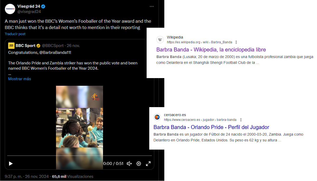 Una mujer con pene acaba de ganar el premio de La Mejor Futbolista del Año 2024 der la BBC y la corporación británica de medios entiende que el hecho de que sea una mujer con pene no es digno de mención en la noticia. Barbra Banda fue jugadora del logroñés, y la primera jugadora de Zambia en jugar para un equipo europeo. Banda militó como atacante en el EDF Logroño; pasó luego al Shanghai Shengli y en la actualidad es atacante del Orlando Pride.