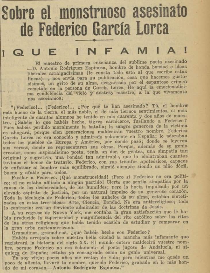 García Lorca cuando se supo de su muerte recibió un homenaje de numerosas publicaciones falangistas, sí, como esta que véis en primera página. Arriba España, es el nombre de la publicación.