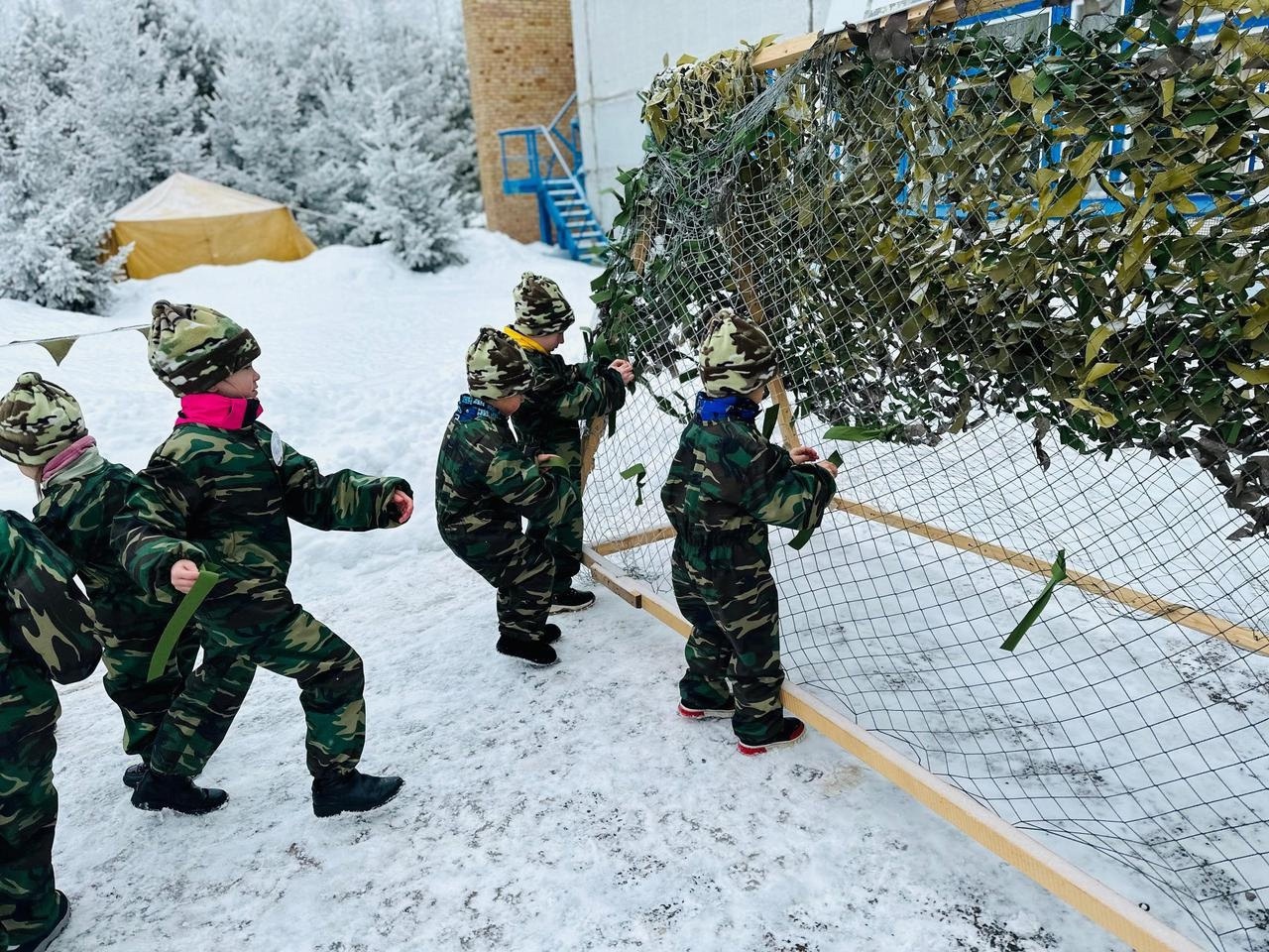Niños rusos en el colegio aprenden con uniformes de guerra e instructores militares enseñando, lo que es la guerra
