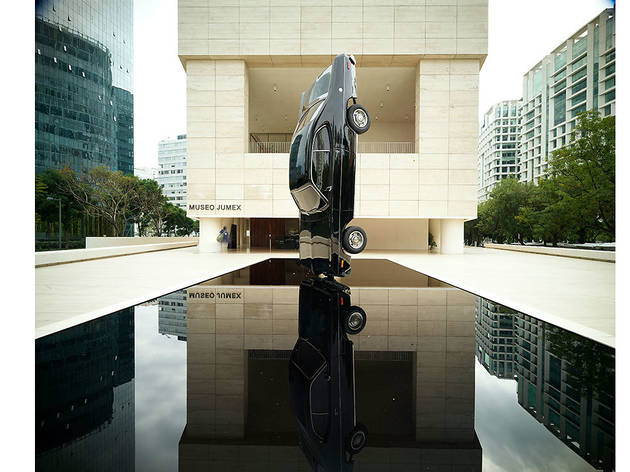 Un icónico automóvil Plymouth Duster de los años 70 aparece suspendido verticalmente sobre un estanque reflectante, en el patio del Museo Jumex (Ciudad de México). El vehículo, capturado justo antes de romper la superficie del agua, representa ese “instante congelado entre la vida y la muerte”, evocando la imposibilidad de detener el tiempo y, a la vez, el deseo de capturar el momento preciso.