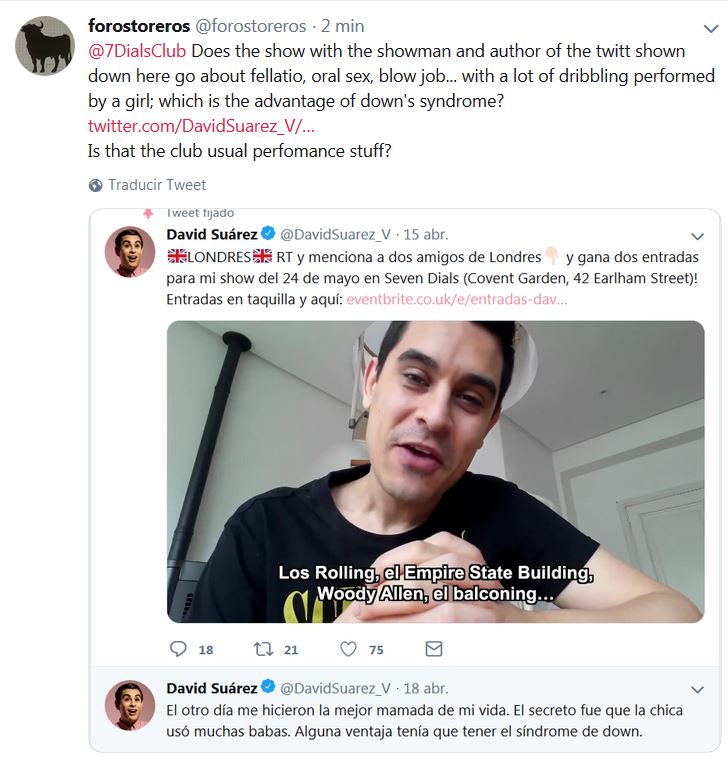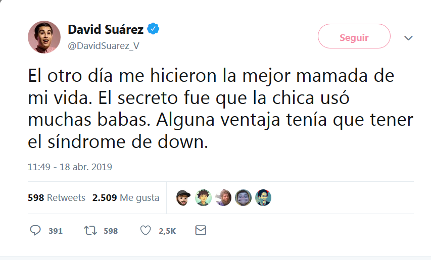 La Cadena Ser ha despedido al "humorista" David Suárez de manera fulminante y definitiva. Un patrocinador de "sus programas" -Vodafone- suspende cualquier tipo de colaboración... ¡BIEN! El "humor" es muy distinto de la ofensa. Como dijo Loquillo, a propósito de los antitaurinos: "insultar no es arte" y aquí la frase cae de justicia. Insultar a un colectivo vulnerable no es arte, no es humor, ni siquiera mal-humor. Es inaceptable. Motivo de tarjeta roja y sanción. Lo que nos alegra mucho.