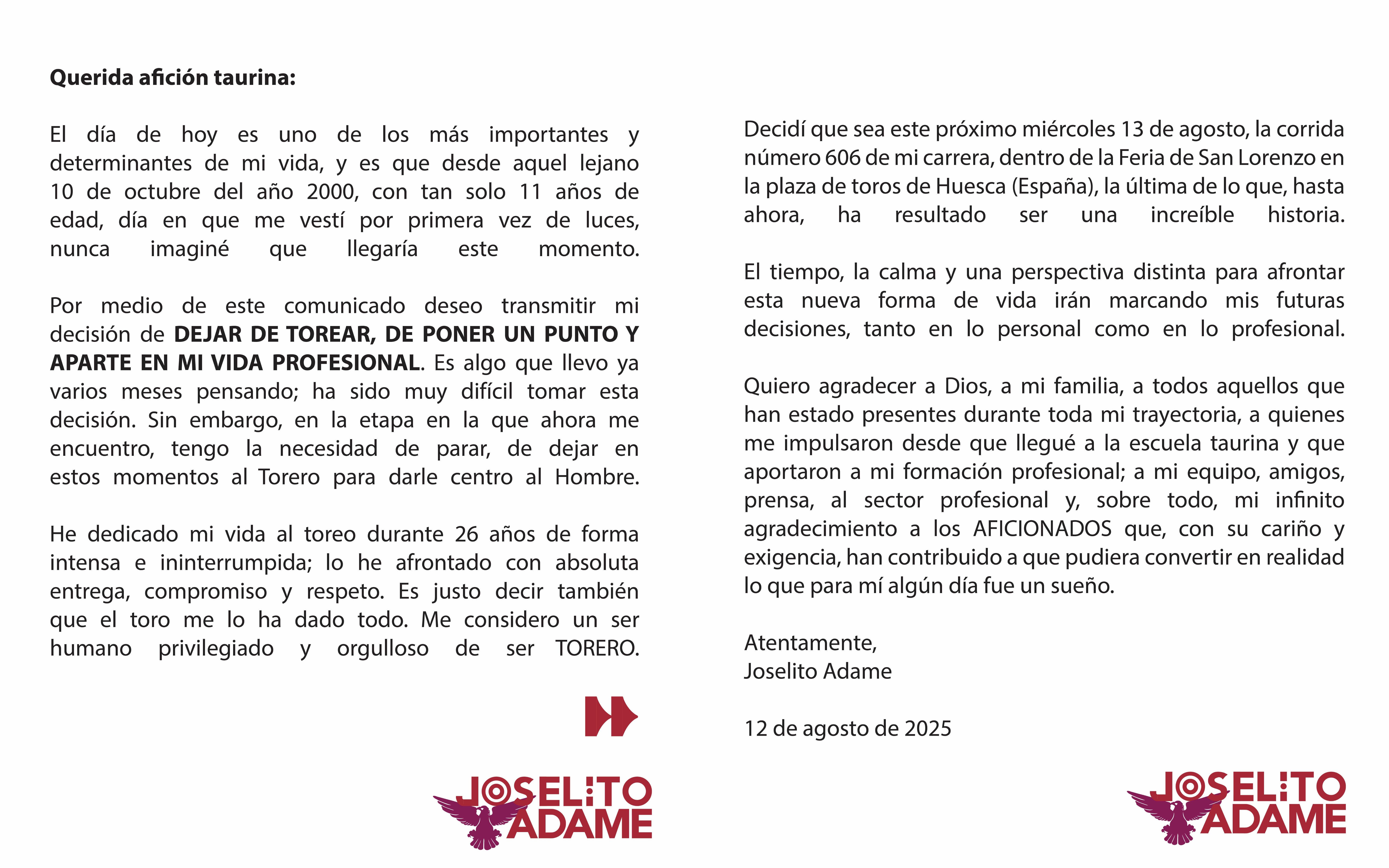 Adame añade que se considera “un ser humano privilegiado y orgulloso de ser torero” después de dedicar su vida a la profesión durante 26 años “de forma intensa e ininterrumpida”, y que ha afrontado “con absoluta entrega, compromiso y respeto”.