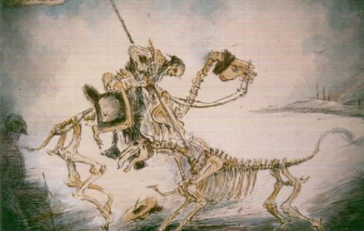 En ese contexto nació su aportación más radical: la Esqueletomaquia, definida por él como el arte de ver más allá de lo visible. Representaba a personas vivas como esqueletos, conservando gesto, carácter y movimiento.