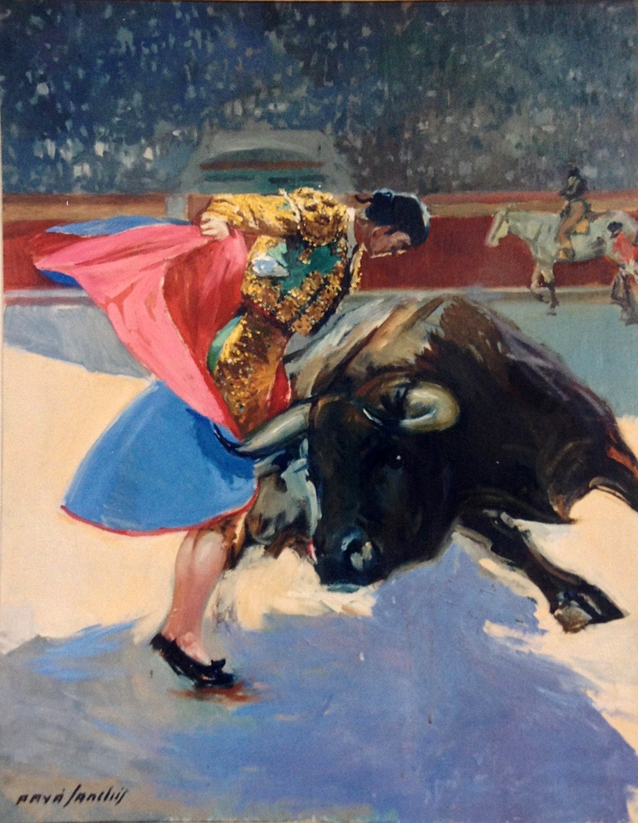 La tauromaquia en Francisco Payá Sanchís se entiende como una extensión natural de su mirada costumbrista: le interesan el rito, la técnica y la gente. En sus cuadros, el toro y el torero están construidos con dibujo sólido, pero lo que termina de “levantar” la escena es el dominio de la luz: el contraste entre sol y sombra en el ruedo, el brillo del traje, el ocre del albero y el rumor del tendido convertido en manchas vivas.