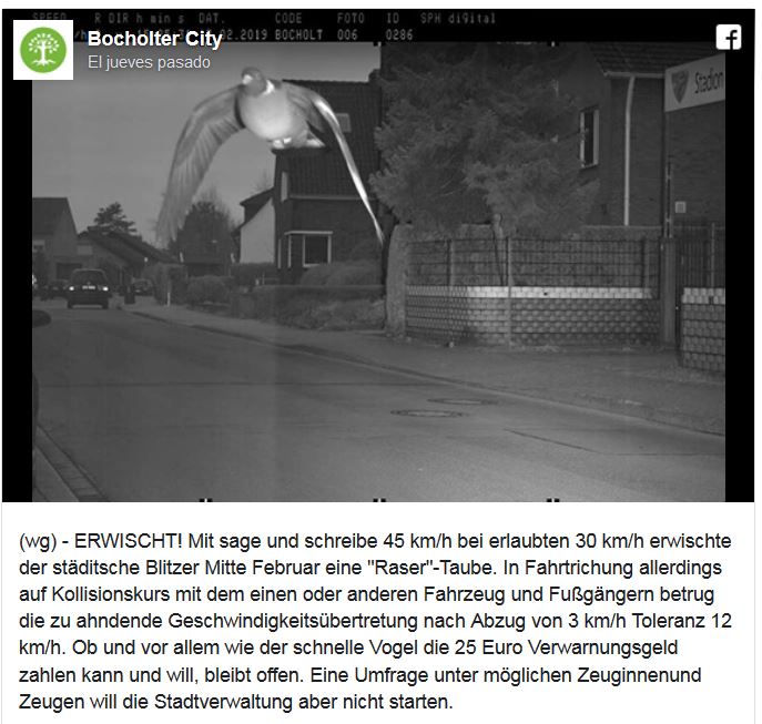 Ha sucedido en Alemania, en la ciudad de Bolchot, donde un radar de tráfico "ha cazado" a una paloma a 45 kilómetros a la hora en una vía limitada a 30 kilómetros y en rumbo de colisión con otro vehículo o un peatón. La multa asciende a 25€ y no será anulada; desde el consistorio indican que tampoco iniciarán trámites para hallar al infractor. Pero aquí queda la fotografía del pájaro sorprendido y los datos de su fechoría: