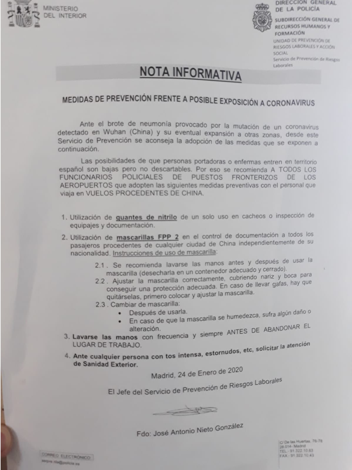 Este es el documento de trabajo enviado desde la Unidad de Prevención de Riesgos Laborales y Acción Social a todos los funcionarios de policía de servicio en los puestos fronterizos con instrucciones específicas hacia viajeros procedentes de zonas de contagio.