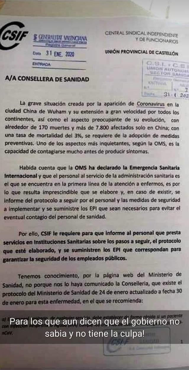 Un sindicato de funcionarios el mismo 31 de enero reclama también medidas de proteccion ante la Consejería de Sanidad de la Generalidad de Valencia. Se trata de la Central Sidical Independiente y de Funcinarios que reitera las razones de la OMS en el mismo día en que se declara la alerta.