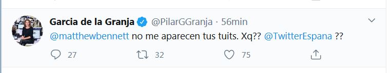 Pregunta Garcia de la Granja @PilarGGranja a Twitter por qué no aparecen los tuits de Matthew Bennet en el perfil de la periodista como véis en este tuit: https://twitter.com/PilarGGranja/status ... 3643520001