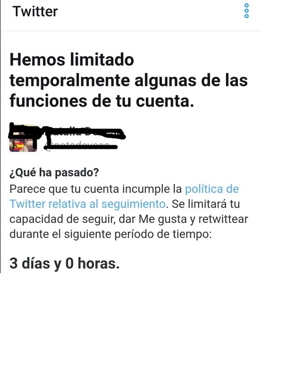 Aquí tenemos otro ejemplo clásico de censura en redes sociales: limitación de las funcionalidades de una cuenta -seguir, dar me gusta, retuitear- durante un tiempo por alguna supuesta infracción.