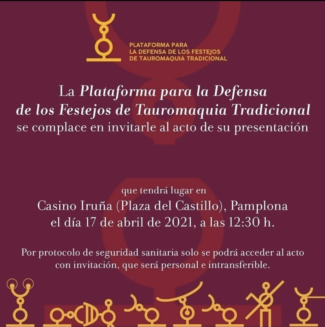 El póximo sábado 17 de abril se presenta en público la Plataforma para la Defensa de los Festejos de Tauromaquia Tradicional. Lo hará en Pamplona, en el casino Iruña.
